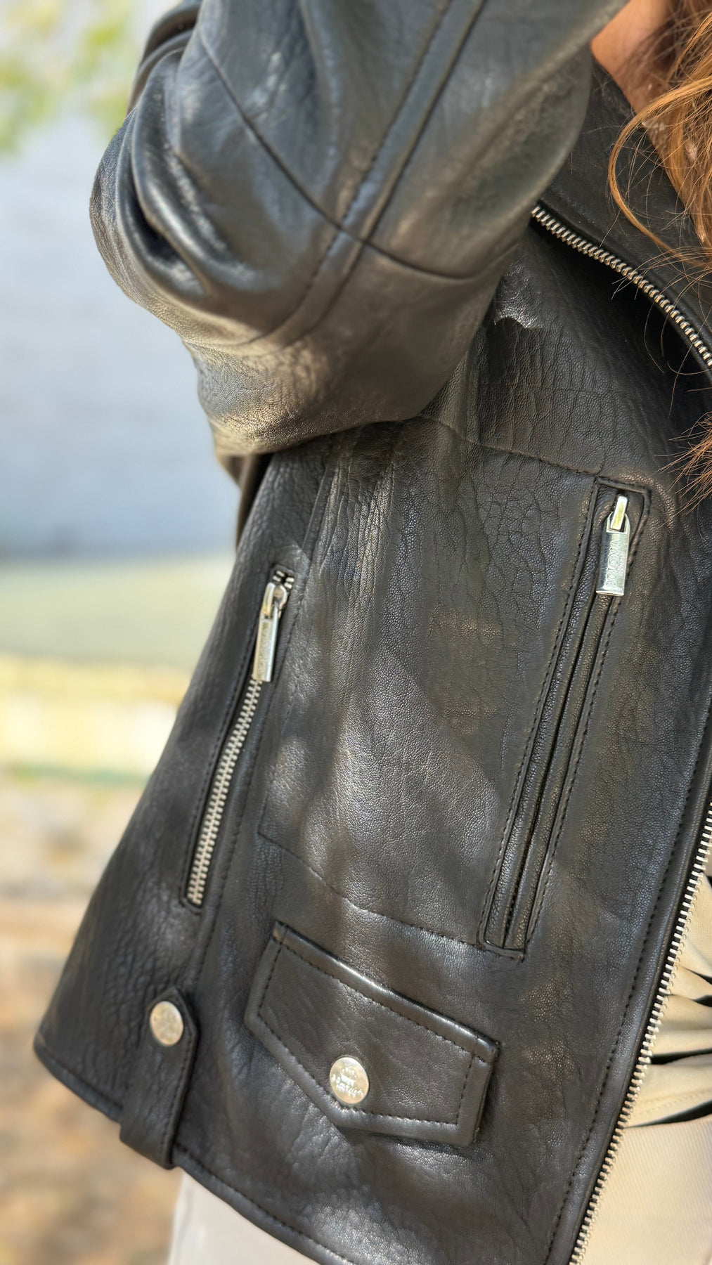 Detalles: Tiene pasadores ornamentales en ruedo y cierres en la manga. Terminación del cuero con textura de burbuja.