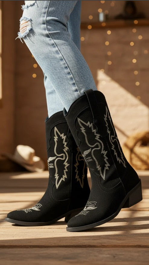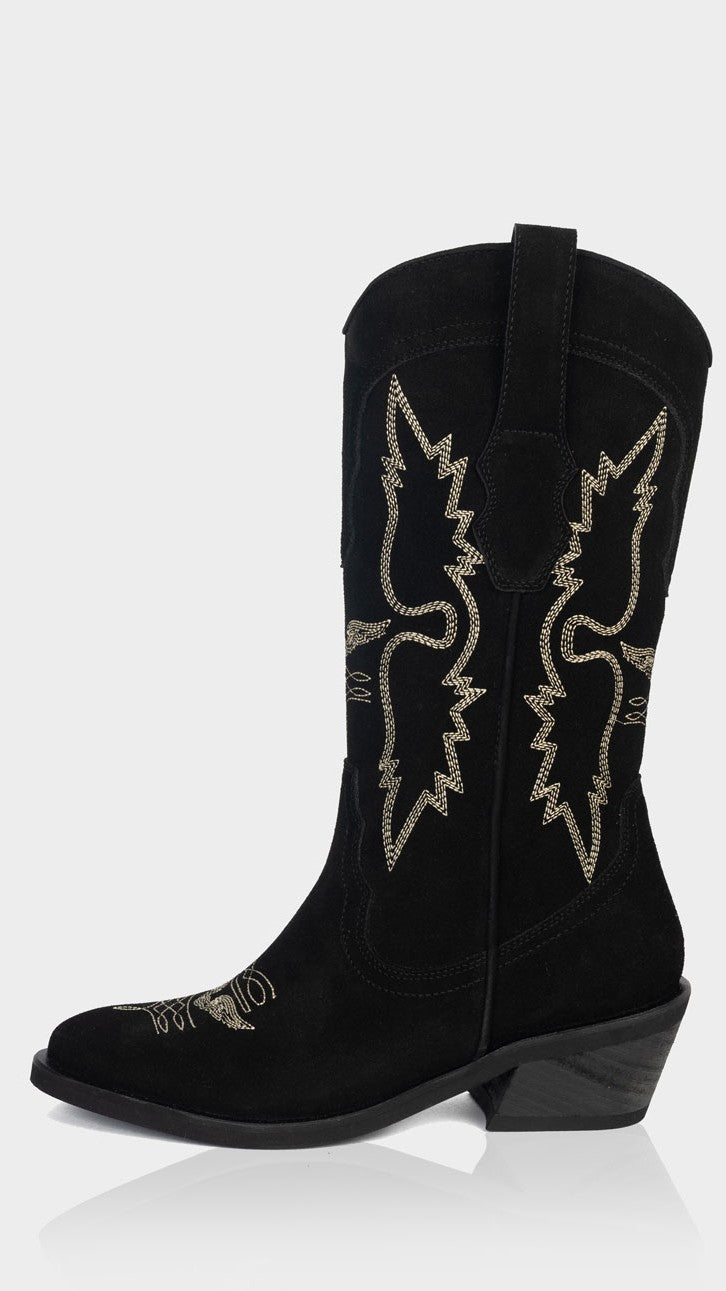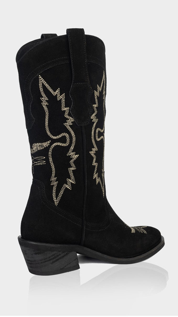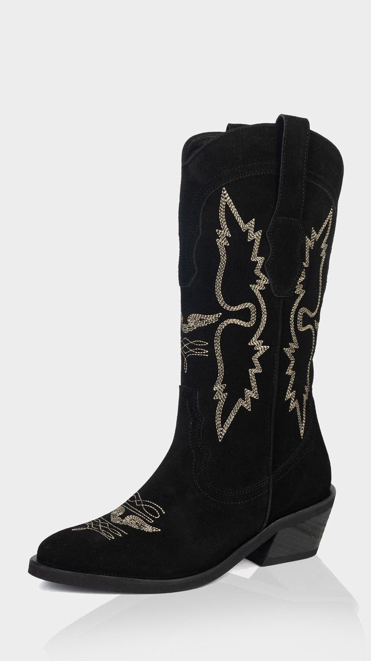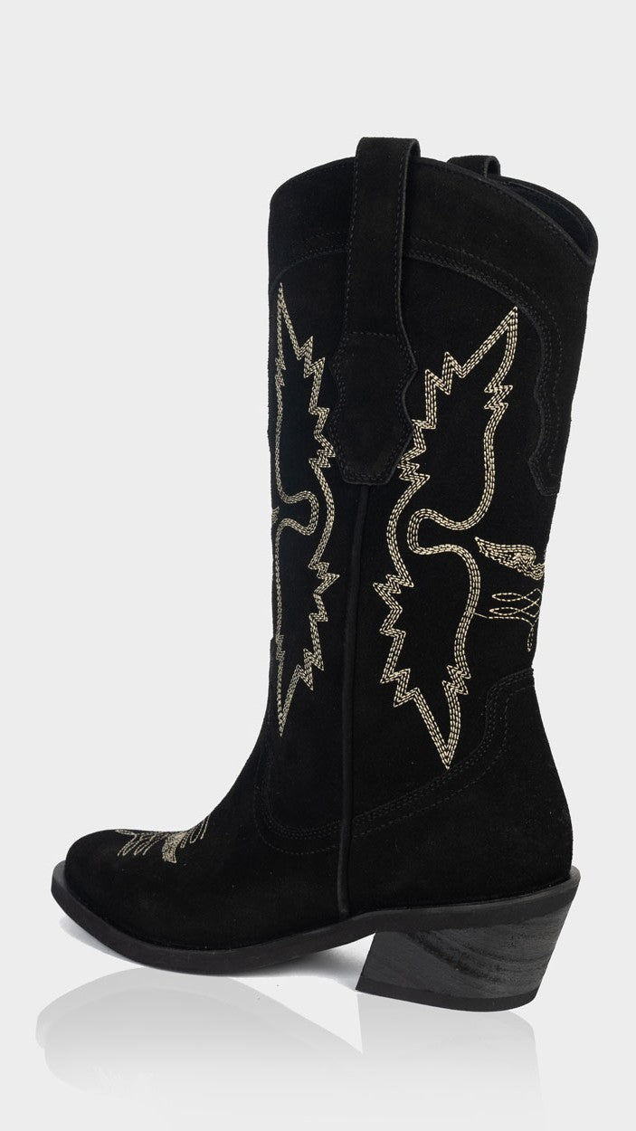 Haz una declaración de estilo, una pieza que combina la tradición western con un diseño moderno y femenino. Confeccionada en gamuza 100% natural, esta bota destaca por sus bordados decorativos inspirados en alas que aportan carácter y un aire distintivo.